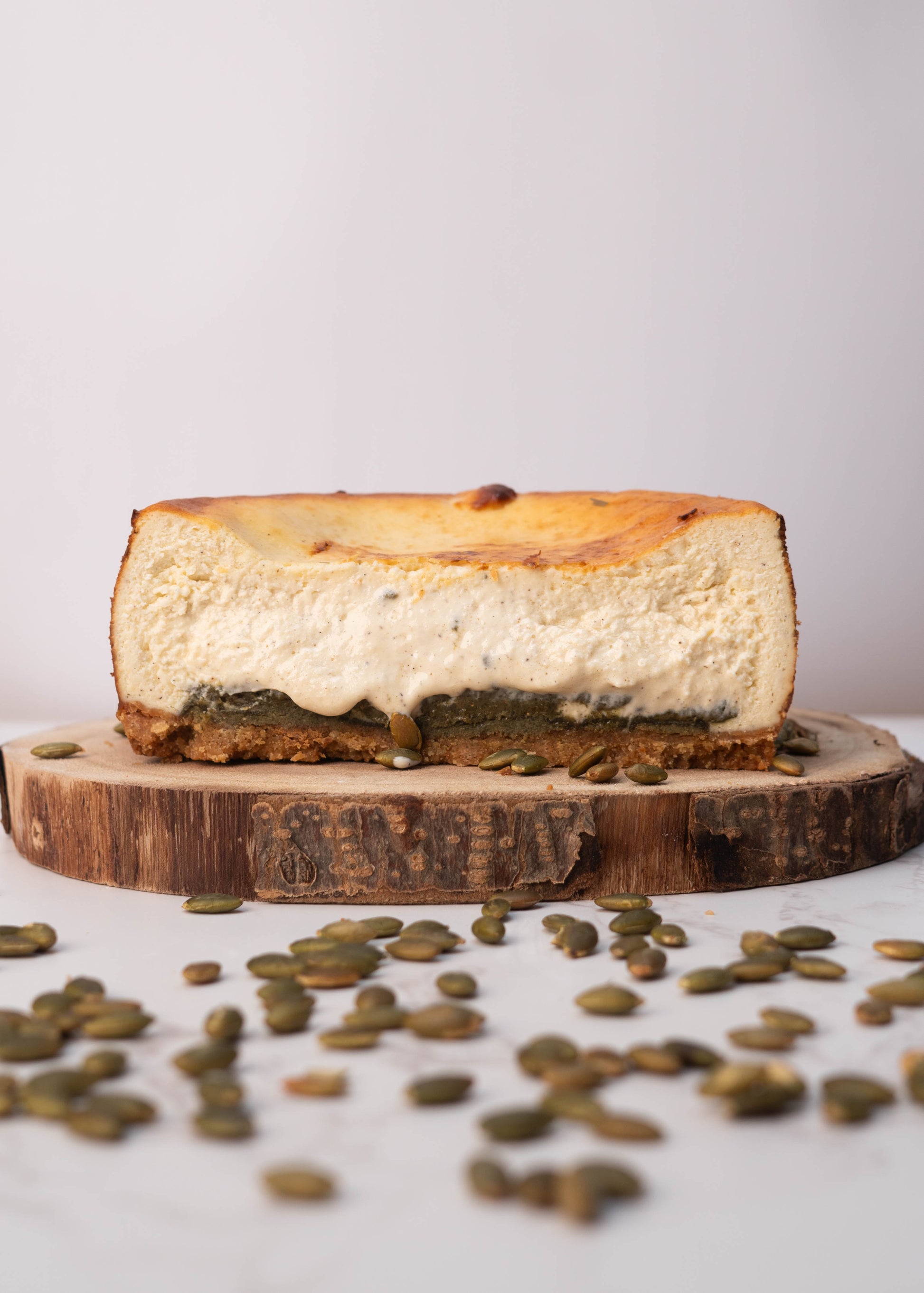Una combinación exquisita de texturas y sabores: base crujiente de galleta de almendras y mantequilla, relleno cremoso de queso y un irresistible praliné de pipas de calabaza, con notas de vainilla Bourbon que recuerdan al delicado sabor del pistacho. Una opción sofisticada y sorprendente.